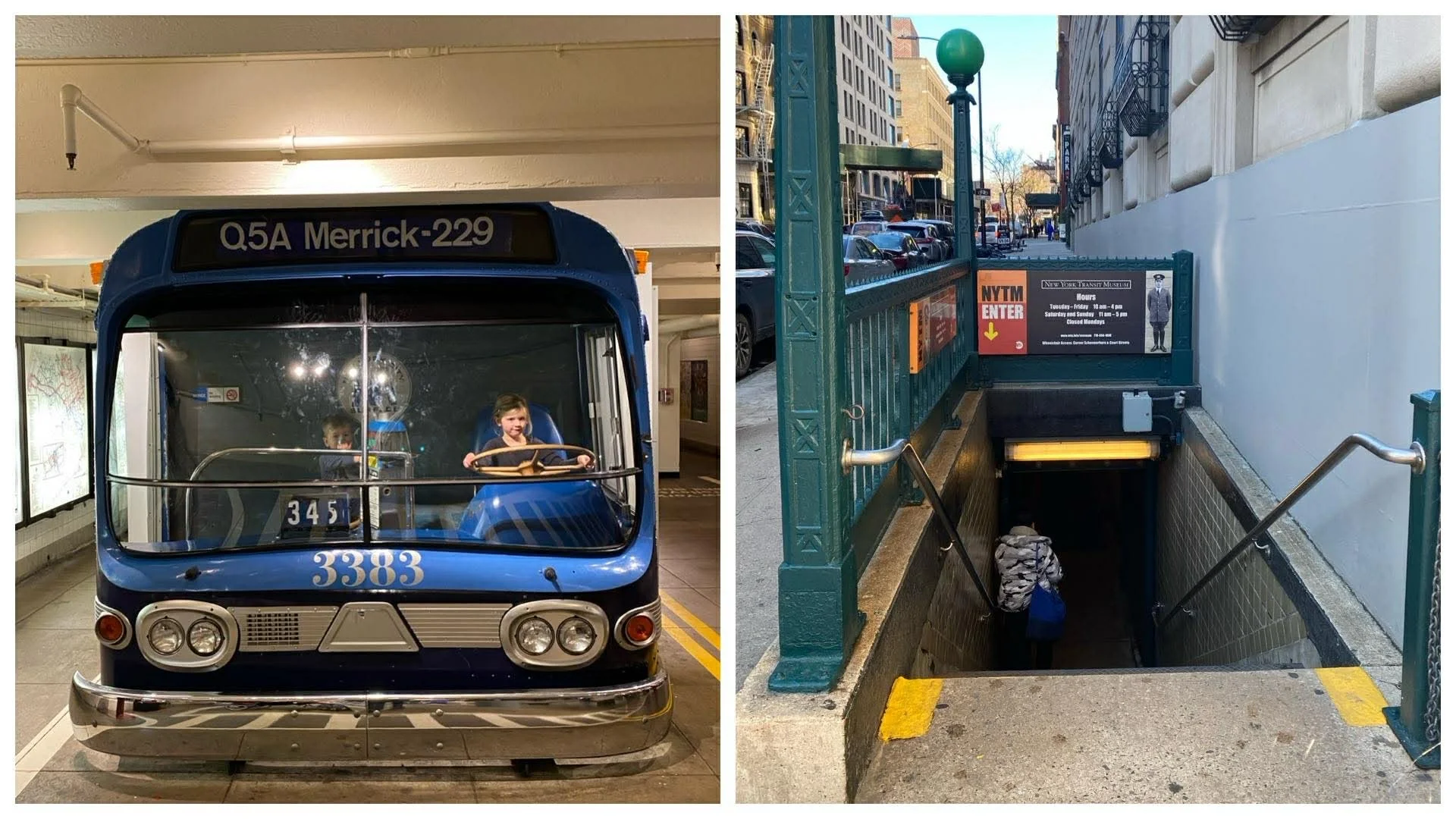 the entrance to the ny transit museum is an old subway station entrance! So cool! Also, don’t let the kids drive the bus!