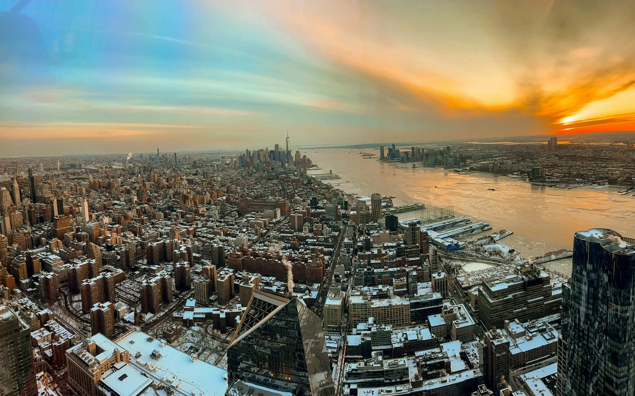 For incredible winter views without freezing the whole time, head to Edge at Hudson Yards. First you’ll walk through a museum explaining how Hudson Yards was built and then you’ll walk out on the 101st floor to floor to ceiling windows. This observation deck has glass walls, offers panoramic skyline views of Manhattan and New Jersey and a portion of the decking is made of glass. Yes, you can walk out on the glass and look down 100 floors. Inside you’ll find a coffee shop, really fun photo ops, clean bathrooms, and even ice cream!