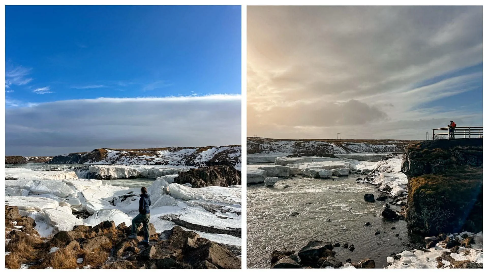 What makes Kerið stand out is the color contrast—the deep red volcanic rock surrounding the crater paired with the vivid blue water inside. The water was frozen when we were there, so it just looked white, but I am sure in summer it’s stunning.